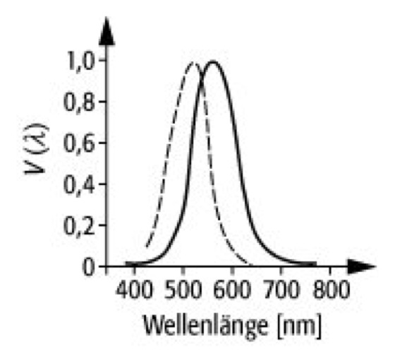 spektrale Empfindlichkeit des Auges: Internationale spektrale Empfindlichkeitskurve V(λ); gestrichelt Dämmerwerte, durchgezogen Tageswerte.