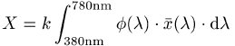 bezeichnet. Die Normfarbwerte X, Y, Z einer Farbe F, die durch eine Farbreizfunktion (Farbreiz) φ(λ) hervorgerufen wird, erhält man durch Addition der einzelnen Normspektralwerte entsprechend ihrem durch φ(λ) gegebenem Anteil; z.B. gilt: