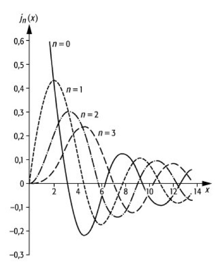 sphärische Bessel-Funktionen, Lösungen der sphärischen Bessel-Gleichung. Es sind dies die sphärischen Bessel-Funktionen der ersten Art (siehe Abb. 1),