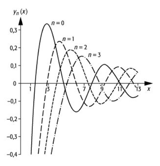 sphärische Bessel-Funktionen 2: sphärische Bessel-Funktionen zweiter Art yn für n = 0,1,2,3.