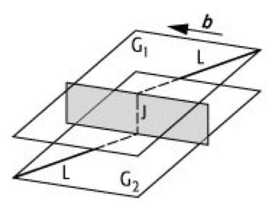 Sprung in einer Versetzung: Sprung J in einer gemischten Versetzung, L: Versetzungslinie, b: Burgers-Vektor, G1 und G2: die beiden Gleitebenen der Versetzung. Die grau unterlegte Ebene ist die Gleitebene des Sprungs.