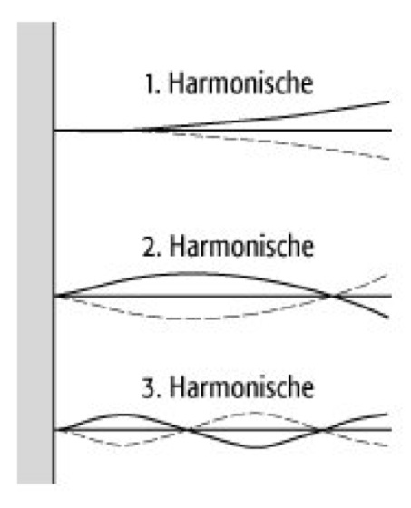 Stabschwingungen 1: Transversalschwingungen (Biegeschwingungen) eines einseitig eingespannten Stabes mit nicht sinusförmigem Schwingungsprofil. Die 1. Harmonische entspricht der Grundschwingung.