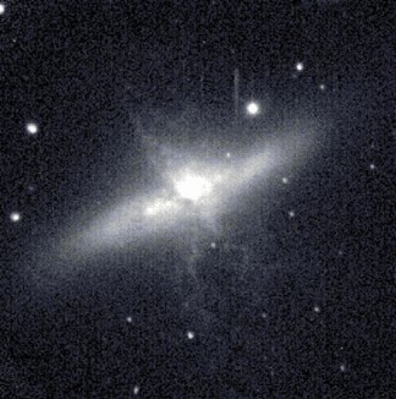 Starburst-Galaxien 1: Die Starburst-Galaxie M82, aufgenommen in einem schmalbandigen Filter, der unter anderem die Emission im Bereich der Hα-Linie umfaßt. Die vom Starburst hervorgerufenen Sternwinde sind deutlich sichtbar.
