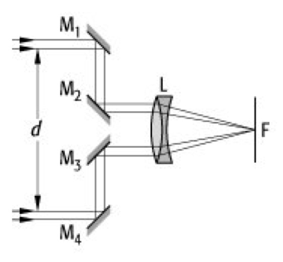 Sterninterferometer: Schemazeichnung; der Spaltabstand d kann durch das Spiegelsystem aus den Spiegeln M1 bis M4 verändert werden. L: Fernrohrobjektiv, F: Brennebene.