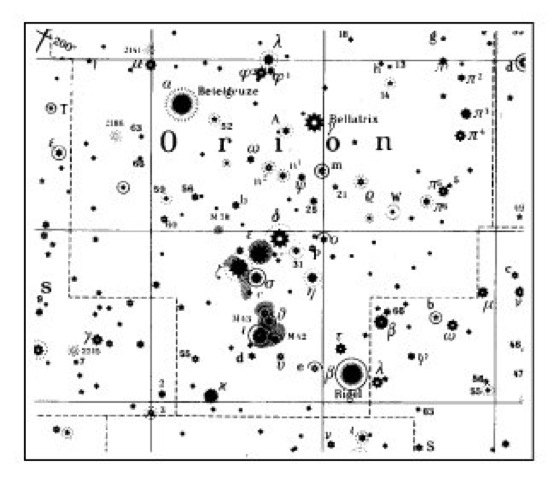 Sternkarte: Ausschnitt des Sternbilds Orion aus dem Himmelsatlas von Schurig-Götz-Schaifers (Epoche 1950,0).