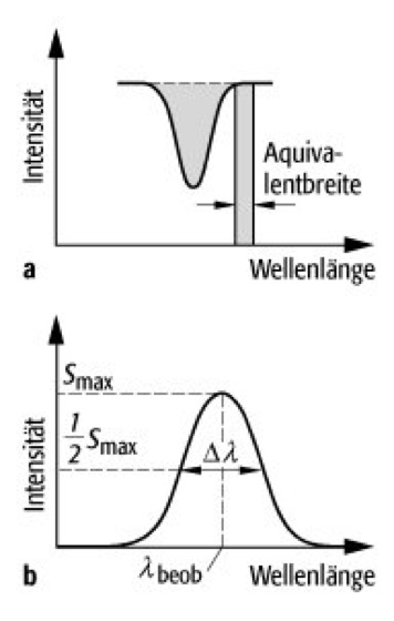 Sternspektren, die von Spektralapparaten sichtbar gemachten Linienspektren der Sterne. Auf Grund ihrer Oberflächentemperatur setzen sich Sternspektren aus zwei Anteilen zusammen. Das Kontinuum entspricht der Strahlung eines Schwarzen Körpers mit der Temperatur der Sternoberfläche. In dieses Kontinuum sind Absorptionslinien und Emissionslinien eingebettet, die von unterschiedlichen chemischen Elementen und ihren verschiedenen Anregungszuständen erzeugt werden. Die Analyse dieser Linien liefert Informationen über die Zustandsgrößen der Sterne, etwa der chemischen Häufigkeit des betreffenden Elements und der Gasdichte an der Sternoberfläche. Entsprechende Informationen erhält man auch aus der Analyse der Spektren von Gasnebeln und Galaxien. Eine Verschiebung von Spektrallinien gegenüber der Laborwellenlänge deutet darauf hin, daß sich der Stern in Bezug auf die Sonne bewegt. Durch die Doppler-Verschiebung werden die Spektrallinien dann zum blauen oder roten Ende des Spektrums verschoben. Die Breite einer Spektrallinie wird durch mehrere Prozesse beeinflußt. Gemessen wird die Linienbreite durch zwei Parameter, die sogenannte Äquivalentbreite und die Halbwertsbreite. Die Äquivalentbreite ist ein Rechteck an der Stelle des Linienzentrums, das dieselbe Fläche besitzt wie die Spektrallinie. Die Halbwertsbreite berücksichtigt das in etwa gaußförmige Profil einer Spektrallinie und gibt die Breite der Linie bei der halben Höhe des Intensitätsmaximums (bzw. Minimums) an. Durch radiale Bewegungen der Sternoberfläche, aber auch durch Stöße mit anderen Gasatomen sowie die kinetische Bewegung der Gasatome, werden die Linien verbreitert, wobei die Effekte oft nur in den Linienflanken, dem Übergangsbereich zum Kontinuum, sichtbar werden. In seltenen Fällen können in Sternspektren auch physikalische Effekte wie der Zeeman-Effekt oder der Stark-Effekt beobachtet werden, die Hinweise auf stellare Magnetfelder geben. Besonders in Gasnebeln treten wegen der geringen Dichte sogenannte verbotene Linien auf. Sie können im Labor nicht reproduziert werden, da sie metastabilen Energieniveaus entsprechen, die bei geeigneter Dichte durch Stöße sofort wieder abgeregt werden. Derartige Linien geben Hinweise auf die Dichte in Gasnebeln.