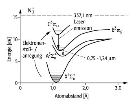 besitzen Emissionswellenlängen zwischen 0,75 und 1,24 μm. Die intensivste Linie des Stickstofflasers bei 337,1 nm resultiert jedoch aus dem Übergang zwischen den jeweils untersten Vibrationszuständen