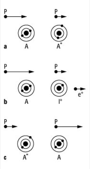 Stoßanregung: Übersicht möglicher Prozesse, a) Stoßanregung, b) Stoßionisation, c) Stoß 2.Art (P: Projektil, A: Targetatom im Grundzustand, A*: Targetatom im angeregten Zustand, I+: Ion). Das Projektil kann ein Elektron, Atom oder Ion sein.