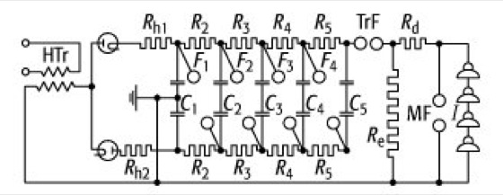 Stoßspannungsgenerator 1: Anlage zur Erzeugung eines Spannungsstoßes. Die Kondensatoren C1 bis C5 sind über die Ladewiderstände R parallel geschaltet und werden so aufgeladen. Die vier Schaltfunkenstrecken F1 bis F4 sprechen bei Erreichen der Überschlagsspannung an und schalten die Kondensatoren in Reihe auf den Prüfkreis.