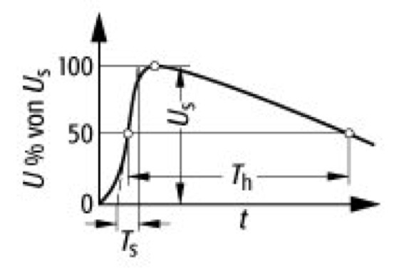 Stoßspannungsgenerator 2: Verlauf eines durch einen Stoßspannungsgenerator erzeugten Spannungsstoßes. Ts ist die Stirnzeit, d.h. die Dauer des ansteigenden Teiles, und Th die Rückenlänge, d.h. die Zeit, in der die Spannung vom Maximalwert auf die Hälfte abfällt. Gängig ist die Stoßwelle ›0,5 / 50‹, d.h. eine Stirnzeit von 0,5 · 10-6 s und eine Halbwertszeit des Rückens von 50 · 10-6 s.