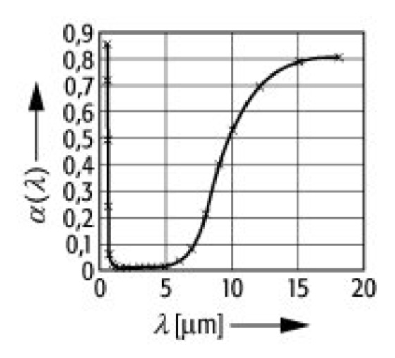 Strahler, grauer: Spektraler Absorptionsgrad α(λ) eines stark selektiven Strahlers, des Glasglühkörpers.