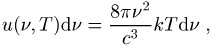 wobei k die Boltzmann-Konstante und c die Lichtgeschwindigkeit ist. Unabhängig davon griff Wien den Gedanken von Boltzmann auf und verfeinerte die Analogie zwischen der Thermodynamik eines Gases und eines Strahlungsfeldes dahingehend, daß er der Strahlung nicht nur eine Energie, sondern auch eine Entropie zuschrieb. Daraus ergibt sich ein weiterer wichtiger Zusammenhang zwischen der spektralen Energiedichte u, der Frequenz n und der Temperatur T eines schwarzen Strahlers: