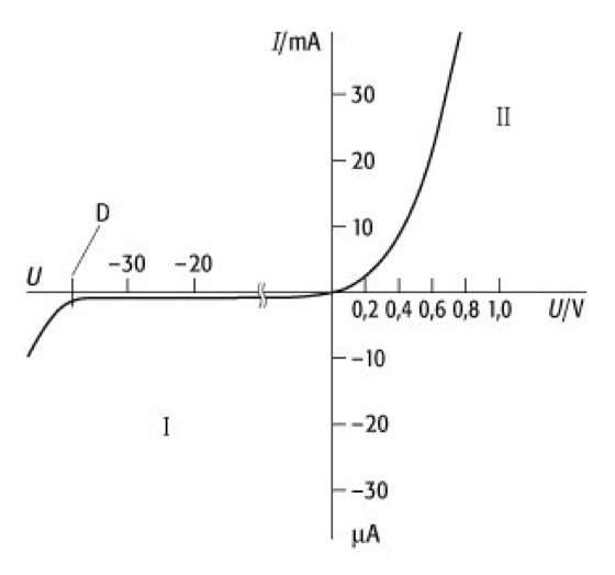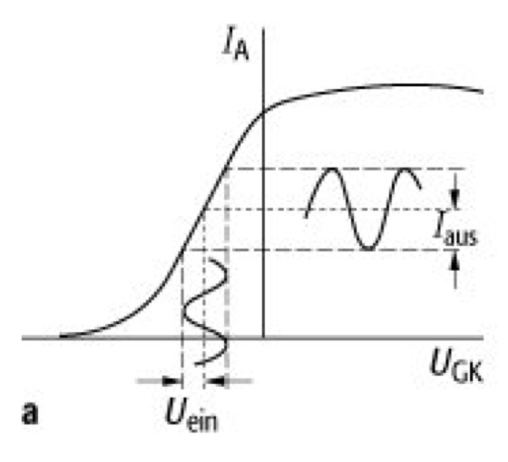 Strom-Spannungs-Kennlinie: a) Vakuumtriode (Anodenstrom-Gitterspannungs-Kennlinie), IA: Anodenstrom, UGK: Spannung Gitter-Kathode, Uein: Eingangsspannung, Iaus: Ausgangssignal, kann an einem Widerstand als Spannung abgegriffen werden; b) p-n-Übergang als Halbleiterdiode; I: Sperrichtung, II: Durchlaßrichtung, D: Durchschlagsspannung (man beachte die unterschiedliche Achseneinteilung in Sperr- und Durchlaßrichtung!)