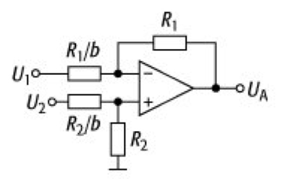 Subtrahierer, eine Schaltung mit einem Operationsverstärker zur Bildung der Differenz zwischen zwei analogen Spannungen. Für die Ausgangsspannung UA gilt unter der Annahme eines idealen Operationsverstärkers (a = b, siehe Abb.)