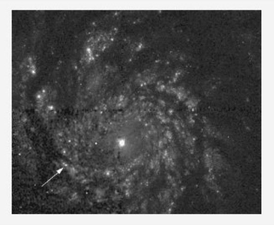 Supernova 1: Supernova in der Galaxie M51. Die Supernova ist durch einen Pfeil markiert. (Photo: NASA)