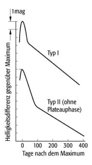 Auf Grund ihrer Lichtkurven und Spektren unterschiedet man mehrere Gruppen von Supernovae. Allen gemeinsam ist ein rascher Helligkeitsanstieg (siehe Abb. 2), der nur in wenigen Fällen beobachtet werden kann, da die Objekte meist erst entdeckt werden, wenn sie sich ihrem Helligkeitsmaximum nähern. Supernovae vom Typ-I besitzen ein relativ schmales Maximum. Ihre Helligkeit fällt danach allmählich ab. Supernovae vom Typ-II besitzen dagegen ein etwas breiteres Maximum, und ihr Helligkeitsabfall geht zunächst etwas schneller, später aber etwas langsamer vonstatten als bei den Typ-I-Supernovae. Daneben weisen Typ-I-Supernovae fast keine Wasserstofflinien auf, während Typ-II-Supernovae solche Linien im Spektrum besitzen.
