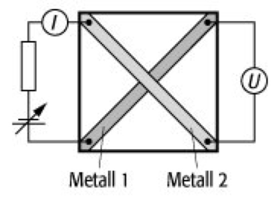supraleitender Tunnelkontakt: Kreuz-Kontakt; die Tunnelschicht ist zwischen den beiden Metallstreifen aufgedampft.