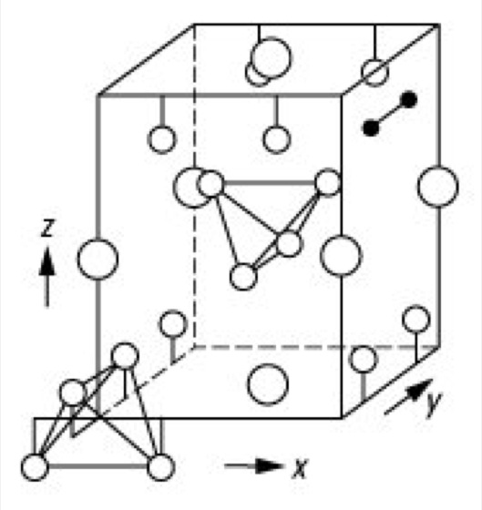 Supraleiter 1: Die Kristallstruktur der A-15-Phasen A3B. Die weißen Kreise bezeichnen die B-Atome, die grau schraffierten die A-Atome.