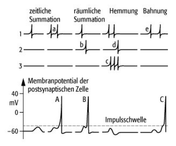 Synapse: Summation, Hemmung und Bahnung. An verschiedenen Synapsen einer Nervenzelle eintreffende Impulse können sich in unterschiedlicher Weise in ihrer Wirkung beeinflussen. So können über ein Erregungsaxon (1) kurz hintereinander eintreffende, ›unterschwellige‹ Impulse (a) summiert werden (zeitliche Summation) und an der Nervenzelle ein Aktionspotential (A) auslösen. Laufen die Impulse (b) über verschiedene Erregungsaxone (1, 2), so entsteht ein Aktionspotential (B) durch räumliche Summation. Impulse (c) vom Hemmaxon (3) können die Wirkung erregender Impulse (d) blockieren (Hemmung). Von Bahnung spricht man, wenn ein Impuls (e) das Ansprechen (C) der Nervenzelle auf einen etwas später eintreffenden Impuls ermöglicht.