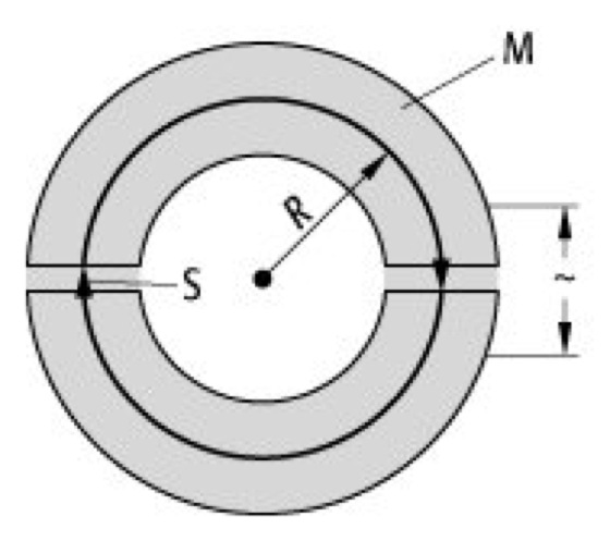 Synchrotron: In zwei Spalten (S) werden die Teilchen in einem Hochfrequenzfeld beschleunigt und in einem zeitlich anwachsendem Magnetfeld (M) senkrecht zur Zeichenebene auf ihrer Sollbahn mit Radius R geführt.