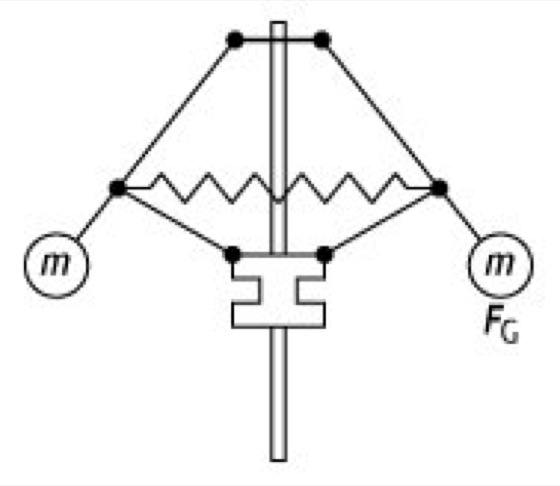 Tachometer: Fliehkrafttachometer zur Drehzahlmessung; m: Schwungmassen, FG: Gewichtskraft.
