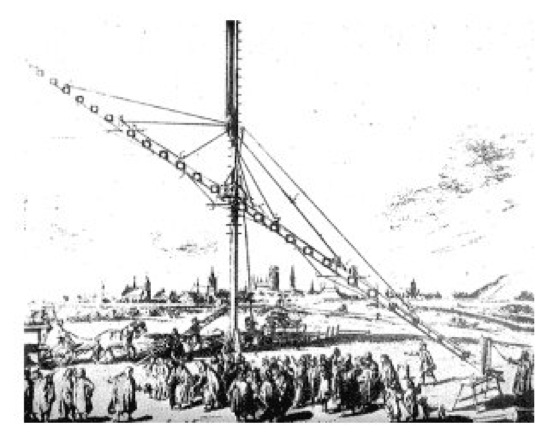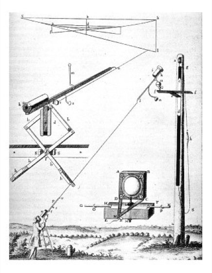 Teleskop 1: Das um 1670 entstandene 40 Meter lange Teleskop von Johann Hevelius (aus: J. Hevelius, Machina Coelestis, 1673).