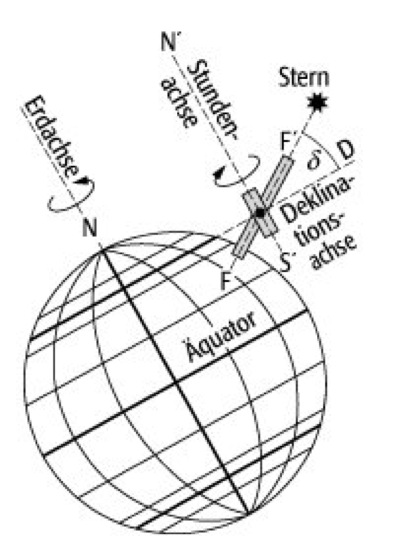 Bei der äquatorialen oder parallaktischen Montierung liegt die sog. Stundenachse parallel zur Erdrotationsachse und senkrecht dazu die Deklinationsachse (siehe Abb. 1). Da bei dieser Montierung die Stundenachse auf den Himmelsnordpol weist, erfolgt die Nachführung des Teleskops lediglich über diese Achse (Koordinatensysteme).