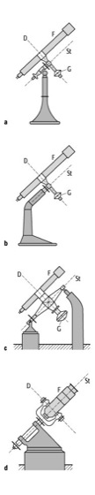 Teleskopmontierung 2: Grundformen parallaktischer Montierungen: a) Deutsche Montierung, b) Kniemontierung, c) Englische Montierung, d) Gabelmontierung (F: Fernrohr, St: Stundenachse, D: Deklinationsachse, G: Ausgleichsgewicht).