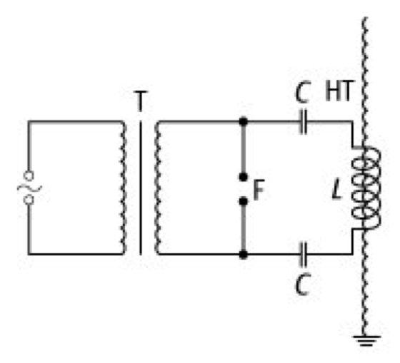 Tesla-Transformator: Schaltbild der Anordnung (T: Transformator, C: Kondensatoren, L: Induktivität des Schwingkreises, F: Funkenstrecke, HT: Hochfrequenztransformator).