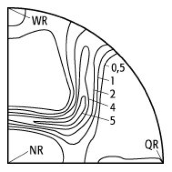 Textur 1: (200)-Polfigur eines Kupferblechs. WR: Walzrichtung, NR: Normalrichtung, QR: Querrichtung. Die Werte auf den Höhenschichtlinien sind im relativen Maßstab angegeben.