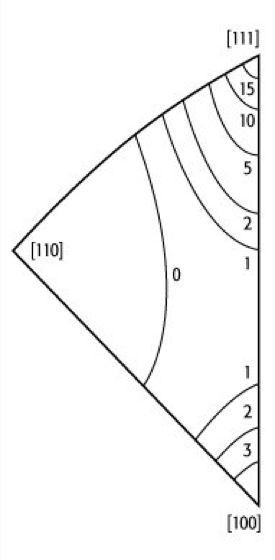 Textur 2: Inverse Polfigur eines Aluminiumdrahtes. Zur Bezeichnung der Kristallebenen siehe Millersche Indizes.