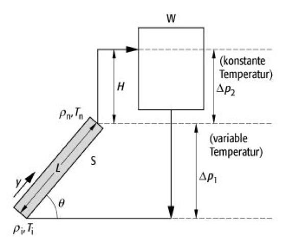 . Bei Kenntnis des Temperaturverlaufs kann also der Auftriebsdruck der Säule bestimmt werden. Dem Thermosiphon-Effekt kommt große Bedeutung in Sonnenkollektoren-Anlagen zu, da bei einer Anbringung des Warmwasserspeichers oberhalb des Kollektors eine Umwälzpumpe entfallen kann.