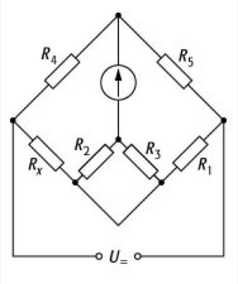 Thomson-Brücke: Schaltbild (Rx: zu bestimmender Widerstand, R1, R3, R5: verstellbare Widerstände, R2, R4: feste Widerstände).