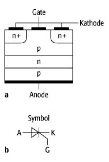 Thyristor, SCR, Silicon-Controlled Rectifier, ein Leistungsschalter für hohe Ströme (kA-Bereich) und hohe Spannungen (10 kV-Bereich) auf Siliciumbasis mit der Schichtenfolge n-p-n-p und den drei Anschlüssen Anode, Kathode und Gate. Bei negativer Anode und positiver Kathode sperren die beiden äußeren p-n-Übergänge, bei umgekehrter Polung sperrt der mittlere p-n-Übergang. Wird bei dieser Polung am Gate eine positive Spannung angelegt, so setzt eine lawinenartige Ladungsträgervermehrung ein, der Thyristor ›zündet‹. Die Anoden-Kathoden-Spannung fällt auf einen sehr niedrigen Wert. Der Strom steigt sehr schnell auf den durch die äußere Beschaltung begrenzten Wert an. Die Gate-Spannung ist im gezündeten Zustand nicht mehr erforderlich, so daß ein Zündimpuls am Gate ausreicht. Der gezündete Zustand kann nur durch eine Stromunterbrechung oder Umpolen der Anoden-Kathoden-Spannung erfolgen. Der Zündvorgang benötigt einige Zeit, die sog. Durchschaltzeit, von typisch 10 μs bis 1 ms, je nach Leistung des Thyristors. Nach dem Abschalten muß zum Ausräumen des mittleren p-n-Überganges die Freiwerdezeit (typisch 10 μs bis einige ms) abgewartet werden, bevor wieder eine positive Anoden-Spannung angelegt werden kann.