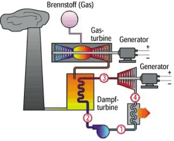 Topping-Zyklus: Schema eines Gas- und Dampfprozesses, bei dem ein Brayton-Gasprozeß als Topping-Zyklus fungiert.
