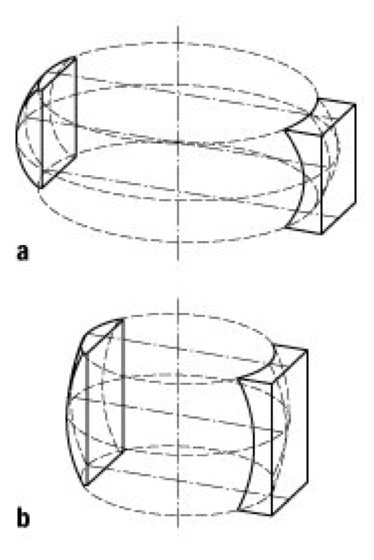 torische Linse: a) wurstförmige torische Fläche, b) tonnenförmige torische Fläche.
