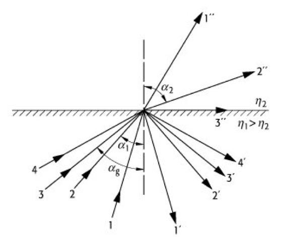 Totalreflexion 1: Schematische Darstellung des Lichtverlaufes im optisch dichteren und optisch dünneren Medium. Wenn der Einfallswinkel kleiner als der Grenzwinkel αg ist, ergibt sich Brechung und Reflexion (1, 2), im umgekehrten Fall Totalreflexion (4).