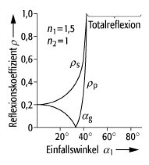 Totalreflexion 2: Reflexionskoeffizient ρ als Funktion des Einfallswinkels α1 für senkrecht (ρs) und parallel (ρp) polarisiertes Licht.