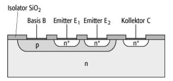 Transistor-Transistor-Logik: Prinzip eines Multi-Emitter-Transistors (in planarer Integrationstechnik).
