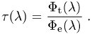 Transmissionsgrad, meistens in Abhängigkeit von der Wellenlänge als spektraler Transmissionsgradτ(λ) angegebenes inverses Verhältnis von auf ein Medium einfallender zu durchgelassener Strahlungsleistung (Φe(λ) und Φt(λ)):