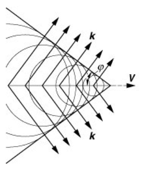 Tscherenkow-Strahlung: Ausbreitung von Tscherenkow-Strahlung in der typischen Kegelform. Die Vektoren k geben die Ausbreitungsrichtung der Tscherenkow-Strahlung an, v ist die Teilchengeschwindigkeit.