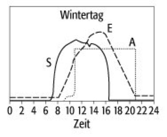 Turmkraftwerk 1: Tagesgang der Sonneneinstrahlung (S), des Energieinhalts des Latentwärmespeichers (E) und der elektrischen Ausgangsleistung (A) eines experimentellen Turmkraftwerks.