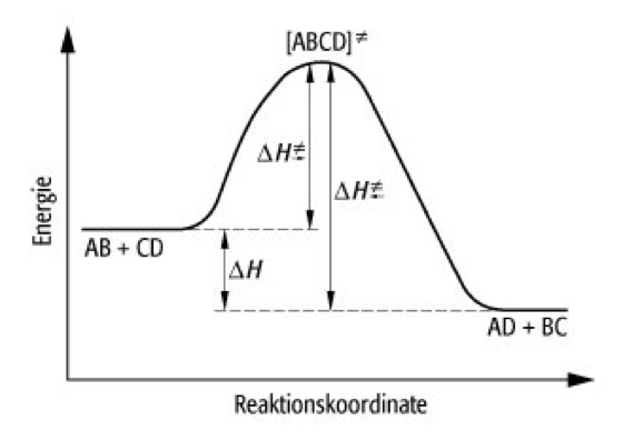 (Eyring-Gleichung; kB: Boltzmann-Konstante, h: Plancksches Wirkungsquantum, T: Temperatur, R: allgemeine Gaskonstante, ΔS und ΔH Aktivierungsentropie und -enthalpie). Das Profil der freien Enthalpie einer chemischen Reaktion wird in einem Reaktionskoordinaten-Diagramm graphisch dargestellt (siehe Abb.).