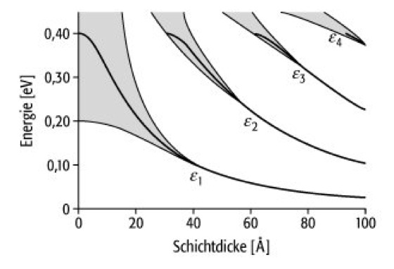 Übergitter 2: Ausbildung von ›Minibändern‹ (grau unterlegte Flächen), die im Kompositionsübergitter bei Verringerung der Schichtdicken durch Überlapp der Quantentöpfe der einzelnen Subbänder mit Energien εi in z-Richtung entstehen. Die Schichtdicke entspricht dem Abstand und der Tiefe der Quantentöpfe.