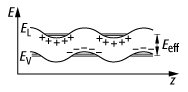 b) Dotierungsübergitter: In diesem Übergitter wird nicht das Material, sondern die Art der Dotierung abgewechselt. Die Dotierung kann nicht völlig abrupt von einer Atomlage zur nächsten geändert werden, es liegt immer ein dünner intrinsischer Bereich (intrinsischer Halbleiter) zwischen den Schichten (p-i-n-Struktur). Da im kompletten Halbleiter das gleiche Fermi-Niveau (Fermi-Energie) bestehen muß, bilden sich wellenförmige Bandkanten aus (siehe Abb. 3). Hierdurch trennen sich Elektronen und Löcher räumlich voneinander, die Elektronen sammeln sich in den Leitungsbandminima, die Löcher in den Valenzbandmaxima, wodurch die Lebensdauer der Ladungsträger außerordentlich stark vergrößert wird. Durch die veränderten Bandkanten ist die Lücke zwischen den Bandkanten verringert. Durch Modulation ist es möglich, die Größe dieser effektiven Bandlücke gezielt einzustellen.