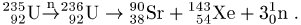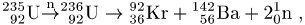 zerfällt bei Beschuß mit thermischen Neutronen in einer hochexothermen Kernspaltungs-Reaktion (15 · 109 kJ / Mol U) in zwei verschieden große Bruchstücke, unter Emission von 2 bis 3 Neutronen:
