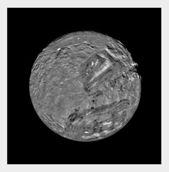 Uranusmonde: Der 490 km große Uranusmond Miranda, aufgenommen mit Voyager 2. Die Oberfläche ist von tiefen Gräben und schroffen Abhängen überzogen. Sie entstanden möglicherweise in Folge eines oder mehrerer Zusammenstöße mit großen Planetoiden. (Photo: NASA)