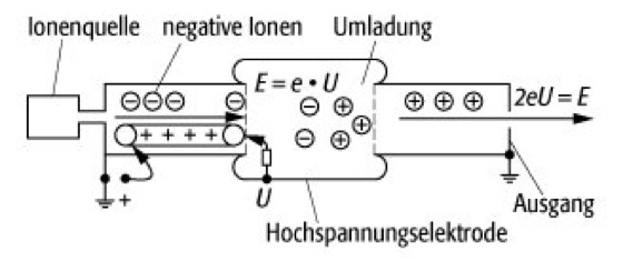 Van-de-Graaff-Beschleuniger 2: Schematischer Aufbau eines Tandem-van-de-Graaff-Beschleunigers.