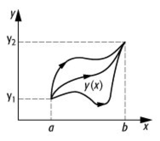 Variationsrechnung: Bestimmung der Kurve y(x), für die das Funktional extremal wird. Diese Kurve ist eingebettet in eine Schar von Vergleichskurven mit denselben Randwerten.
