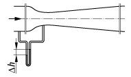 Venturi-Düse: Schemazeichnung. Die Druckdifferenz zwischen schmalster und weitester Stelle ist der Höhendifferenz Δh proportional.